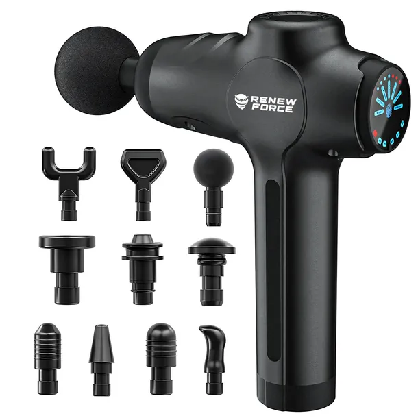 ✅Pistolet do masażu: masażer do pleców, ciała, nóg, karku, stóp, 120W z 10 końcówkami. WYSOKIEJ KLASY MASAŻER DO CIAŁA Wysokiej klasy pistoletowy masażer do ciała to wielofunkcyjne urządzenie pozwalające na rozluźnienie i stymulowanie wszystkich grup mięśniowych. Zestaw posiada aż 10 wymiennych końcówek, które umożliwiają rozmasowanie każdych bolesnych bądź potrzebujących tego partii ciała. Znajdujące się w zestawie głowice takie jak: Głowica kulista Głowica w kształcie litery "U Głowica łopatkowa Głowica płaska Głowica cylindryczna Głowica typu grzybek Głowica wieża Głowica kciuk 2x Głowica bullet Dają możliwość dotarcia do najbardziej ukrytych bolących części ciała. WYDAJNY MASAŻER POWIĘZIOWY Masażer od Renew Force, jest przełomowym urządzeniem w świecie masażerów. Zapewnia dogłębny masaż powięziowy, który regenruje, wzmacnia i poprawia kondycję mięśni i tkanek. Charakteryzuje się wydajnością, mocą, ilością obrotów na sekundę, a dzięki dołączonym do niego głowicom pobija konkurencyjne masażery. Z masażerem od Renew Force możesz zapomnieć o wydawaniu fortuny na masażystę, do którego musisz chodzić często, żeby zauważysz jakiekolwiek efekty. Zapomnij o staniu w kolejkach. Jedyne co musisz zrobić to wejść w posiadanie masażera, rozsiąść się w fotelu i relaksować się przy jego pomocy. Teraz to co dostałbyś w salonie masażu, możesz mieć w domu. SPECYFIKACJA GŁOWIC Głowica kula - przeznaczona do rozlużniania mięśni. Jej tekstura jest równa i miękka. Polecana miłośnikom sportów typu fitness, joga, pilates, stretching Głowica w kształcie litery "U" - nadaje się do masażu kręgosłupa oraz pleców. Intensywność między dwoma punktami jest równa. Dobrze nadaje się do masażu akupunkturowego. Głowica łopatkowa - Nadaje się do masażu klatki piersiowej, kości wszystkich części ciała, tkanek miękkich oraz wszystkich bardziej wrażliwych części ciała. Głowica płaska - Nadaje się do masażu całego ciała. W oparciu o krótką konstrukcję górnej części oraz mały łuk, nadaje się do relaksacji całego ciała i zapewnia intensywniejsze odczucie masażu. Głowica bullet 1 - Pełne doświadczenie uderzenia. Ta głowica doskonale się sprawdzi przy masażu dłoni, ścięgna Achillesa, romboidalnych mięśni pleców, meridianów. Głowica wieża - Odpowiedni dla mięśni łydek, ramion, brzucha Głowica bullet 2 - Pełne doświadczenie uderzenia. Ta głowica doskonale się sprawdzi przy masażu dłoni, ścięgna Achillesa, romboidalnych mięśni pleców, meridianów. Głowica typu grzybek - Delikatniejsza wersja głowicy cylindrycznej. Zastosowanie w użytkowaniu takie samo. Głowica cylindryczna - umożliwia dogłębne rozmasowanie tkanek miękkich. Ze względu na jej kształt oferuje podwójny efekt punktowego uderzenia z masażem Głowica kciuka - Daje podobne doznania do prawdziwego uciskania kciukiem. Służy do relaksacji różnych partii ciała. SPECYFIKACJA EKRANU Wskaźnik siły nacisku - czerwone kropki oznaczają, że powinieneś przykładać masażer do ciała z mniejszą siłą. Wskaźnik prędkości Wskaźnik naładowania baterii Przycisk uruchamiania ZESTAW ZAWIERA: pistolet masujący; 10 wymiennych końcówek przewód ładowania USB-C wymienne uszczelki do głowic masujących instrukcję obsługi w języku polskim oryginalne opakowanie