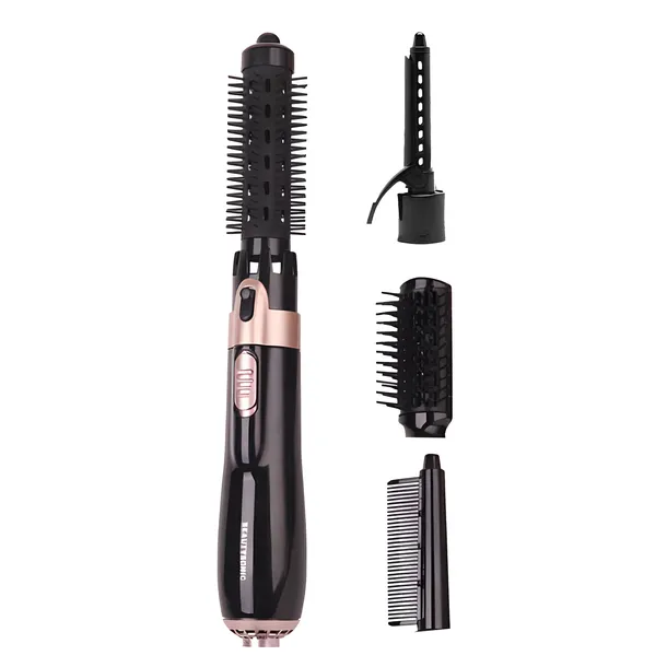 ✅Suszarko-lokówka 4w1, wielofunkcyjna lokówko-suszarka do stylizacji włosów, z zestawem wymiennych szczotek, idealna do suszenia, prostowania, lokowania i nadawania objętości. Zadbaj o swój wygląd z naszą lokówko-suszarką 4w1 i ciesz się zdrowymi, lśniącymi włosami każdego dnia. Lokówko-suszarka 4w1 Lokówko-suszarka to idealne urządzenie do codziennej stylizacji włosów, które łączy funkcje suszenia, modelowania, dodawania objętości i wygładzania w jednym. Dzięki wielofunkcyjności pozwala zaoszczędzić czas, jednocześnie gwarantując efekt jak z salonu fryzjerskiego. 2 poziomy mocy Lokówko-suszarka oferuje dwustopniową regulację mocy, która umożliwia dostosowanie urządzenia do indywidualnych potrzeb: Ciepły nadmuch - niska moc idealny do delikatnego suszenia włosów i codziennej stylizacji. Ciepły nadmuch - wysoka moc pozwala na szybkie suszenie i modelowanie nawet gęstych, trudnych do ułożenia włosów. Dzięki temu lokówko-suszarka jest uniwersalna i spełnia oczekiwania każdej użytkowniczki. 4 wymienne nasadki Dwie końcówki zwiększająca objętośćNasadka idealna dla osób, które chcą dodać włosom objętości u nasady. Pozwala unieść włosy, nadając fryzurze lekkości i naturalnego wyglądu. Dwie okrągłe szczotki do wszystkich rodzajów włosówSzczotki o różnej średnicy ułatwiają stylizację zarówno krótkich, jak i długich włosów. Sprawdzają się doskonale przy tworzeniu fal, loków lub wygładzania niesfornych kosmyków. Ergonomiczny uchwyt i obrotowy kabel 360° Urządzenie zostało zaprojektowane z myślą o komforcie użytkowania. Ergonomiczny uchwyt ułatwia operowanie lokówką, a obracający się o 360° kabel zapobiega plątaniu, zapewniając pełną swobodę ruchów podczas stylizacji. Stwórz fryzurę swoich marzeń i nie trać czasu na skomplikowane stylizacje. Nawiew zimnym powietrzem – trwałość stylizacji Lokówko-suszarka została wyposażona w funkcję nawiewu zimnego powietrza, która pozwala na skuteczne utrwalenie każdej stylizacji. Zimny nadmuch zamyka łuski włosów, nadając im blask i trwałość na cały dzień. Dzięki tej funkcji fryzura wygląda profesjonalnie i utrzymuje się dłużej, nawet w trudnych warunkach atmosferycznych. To idealne rozwiązanie dla osób, które chcą cieszyć się perfekcyjną fryzurą przez wiele godzin. Co zrobisz dzięki naszej lokówko-suszarce? Nasza lokówko-suszarka 4w1 pozwala na stworzenie szerokiej gamy stylizacji: od efektownych loków i fal, przez podkreślenie objętości, aż po idealnie gładkie włosy. Dzięki różnym nasadkom i regulacji mocy możesz dostosować urządzenie do swoich potrzeb, niezależnie od rodzaju i długości włosów. Dodatkowo, szybkie nagrzewanie oraz funkcja zimnego nawiewu sprawiają, że stylizacja staje się szybka, efektywna i trwała. Ciesz się profesjonalnym wyglądem na co dzień bez konieczności wizyt w salonie fryzjerskim! Spraw, by Twoje włosy zawsze wyglądały perfekcyjnie – niezależnie od okazji! Zmień swoją codzienną stylizację włosów na lepsze dzięki naszej lokówko-suszarce 4w1! Profesjonalne efekty, łatwa obsługa i trwałe rezultaty w jednym urządzeniu. Zamów teraz i odkryj, jak prosta i przyjemna może być pielęgnacja włosów. Co w zestawie? Lokówko-suszarka 4w1 2 końcówki do zwiększania objętości 2 okrągłe szczotki do różnych typów włosów Uchwyt do zawieszania Instrukcja obsługi